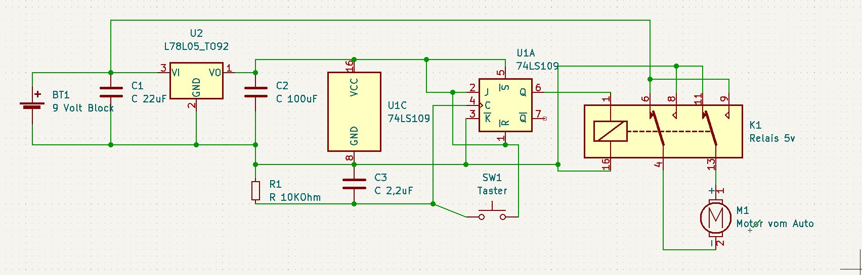 Ganz einfach beim auffahren des Wagens schaltet der Taster...gibt dem JK FlipFlop den impuls zum schalten...Relais schaltet, Motor dreht die Richtung und Wagen lenkt.