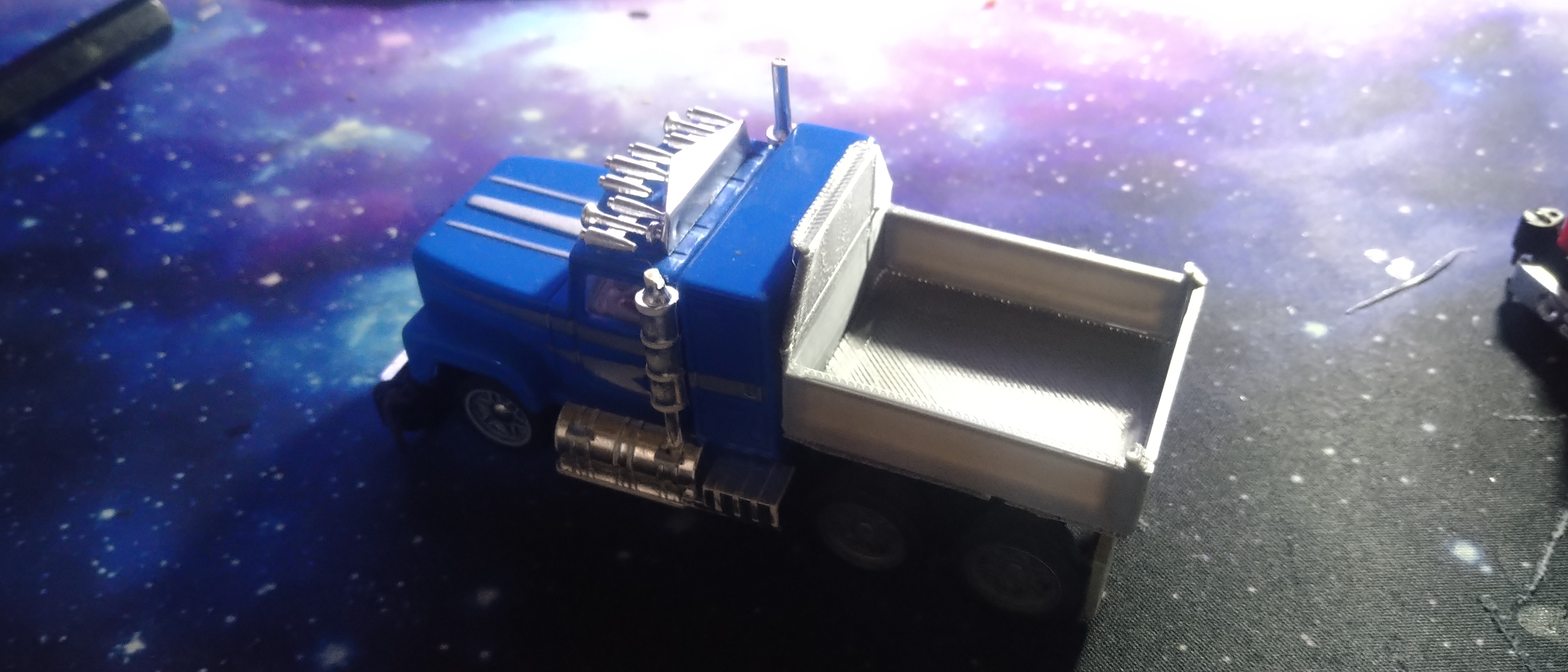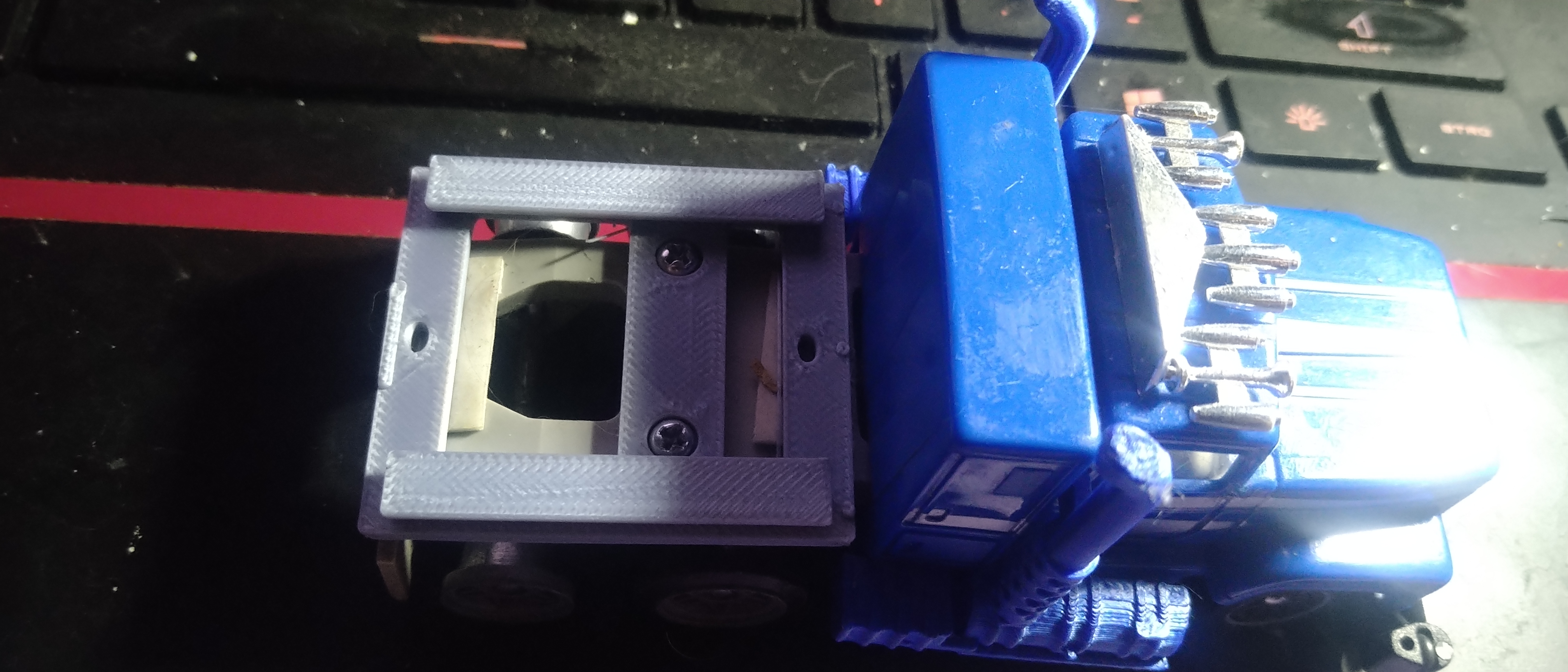 Befestigung: Aufbau direkt mit dem Träger verkleben. Das ganze mit 2 Doppelseitigen Klebepads am Heck des Trucks befestigen.